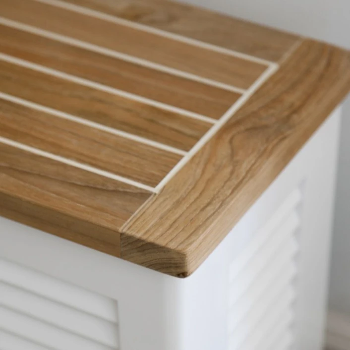Smart liten skittentøykurv i hvit. Classic skittentøykurv er fremstillet i hvitmalet mahogni og har en dør i teak. Den fine skittentøykurv vil passe inn i de fleste hjem.