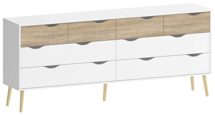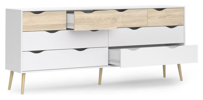 Moderne hvit skjenk. Designet er nordisk inspirert, som gjør skjenken veldig anvendelig. Den hvite fargen, kombinert med treet, skaper et flott utseende. Det organiske materialet skaper en hyggelig stemning i rommet. Skjenken inneholder, med sine otte skuffer masse god oppbevaringsplass.