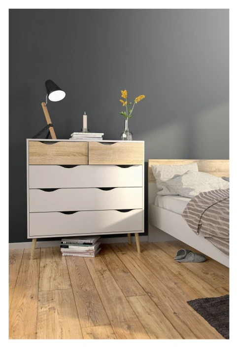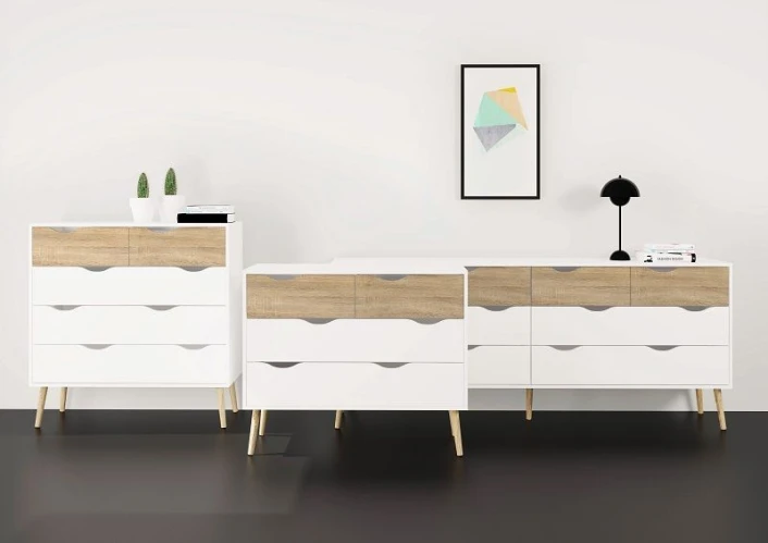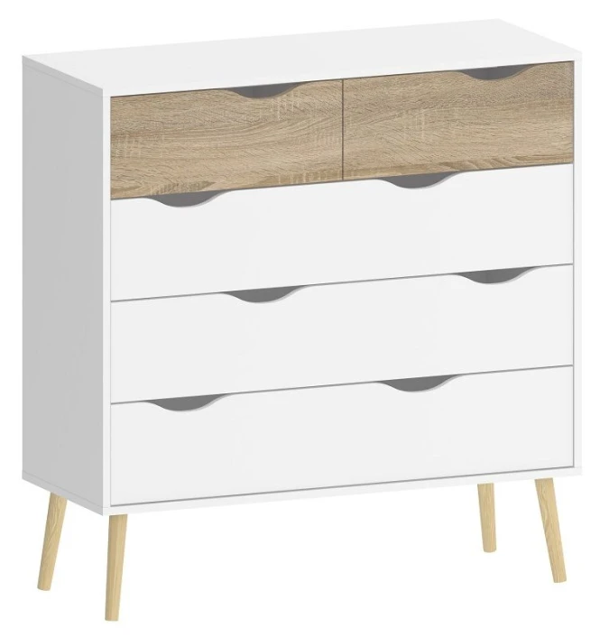 Klassisk kommode i hvit. Designet er nordisk inspirert, som gjør kommoden veldig anvendelig. Den hvite fargen, kombinert med treet, skaper et flott utseende. Det organiske materialet skaper en hyggelig stemning i rommet.