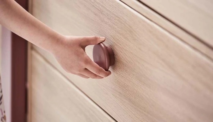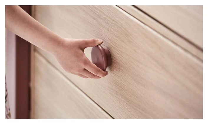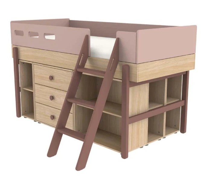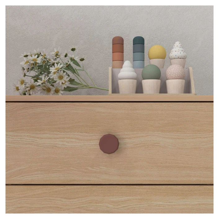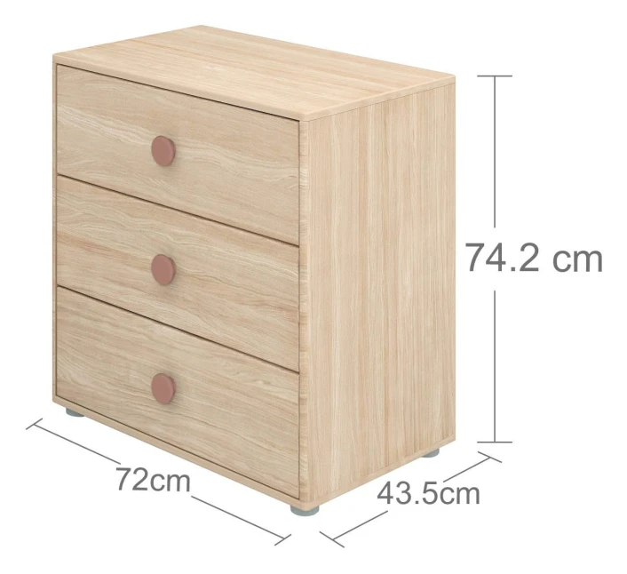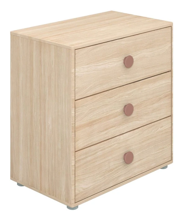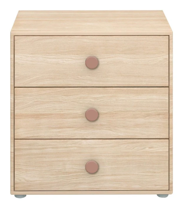 Kommode i eikefinér på MDF med 3 skuffer med rosa håndtak. Passer under FLEXA Popsicle halvhøy seng.