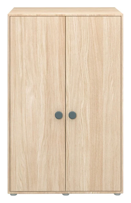 Lavt garderobeskap i eikefinér på MDF med 2 dører og blå håndtak. Passer under FLEXA Popsicle høyseng.