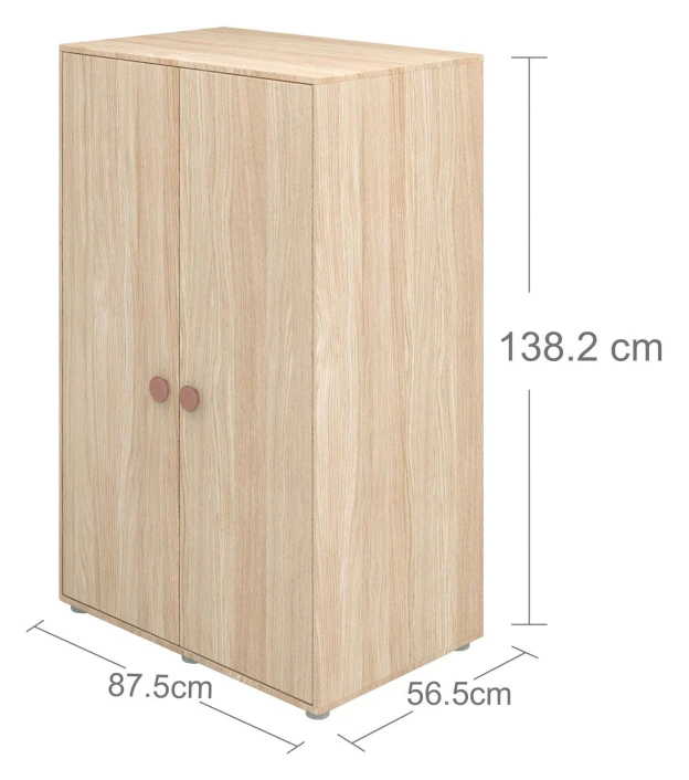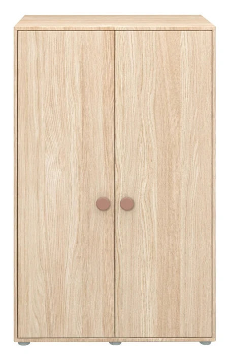 Lavt garderobeskap i eikefinér på MDF med 2 dører og rosa håndtak. Passer under FLEXA Popsicle høyseng.