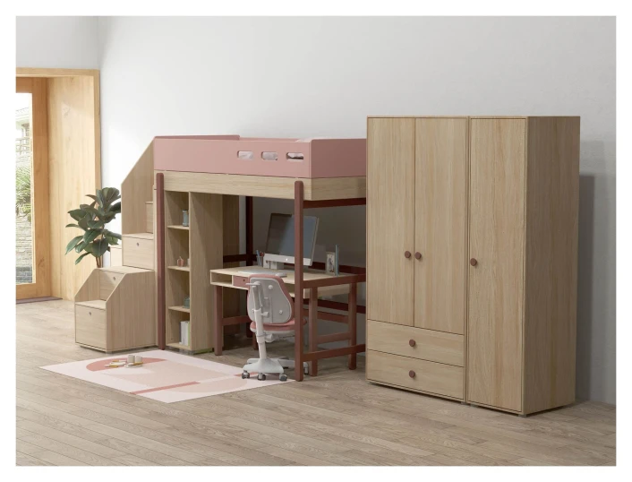 Smalt, høyt skap i eikefinér på MDF med én dør og rosa håndtak.