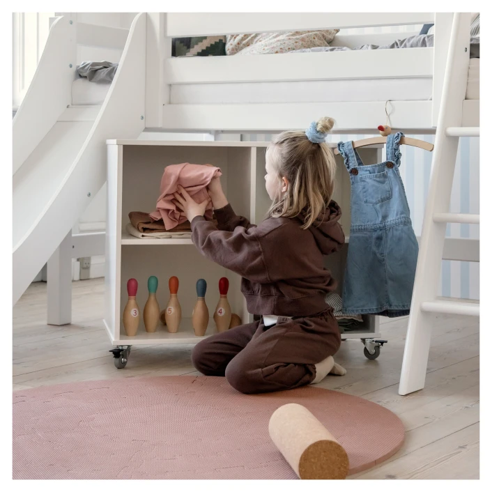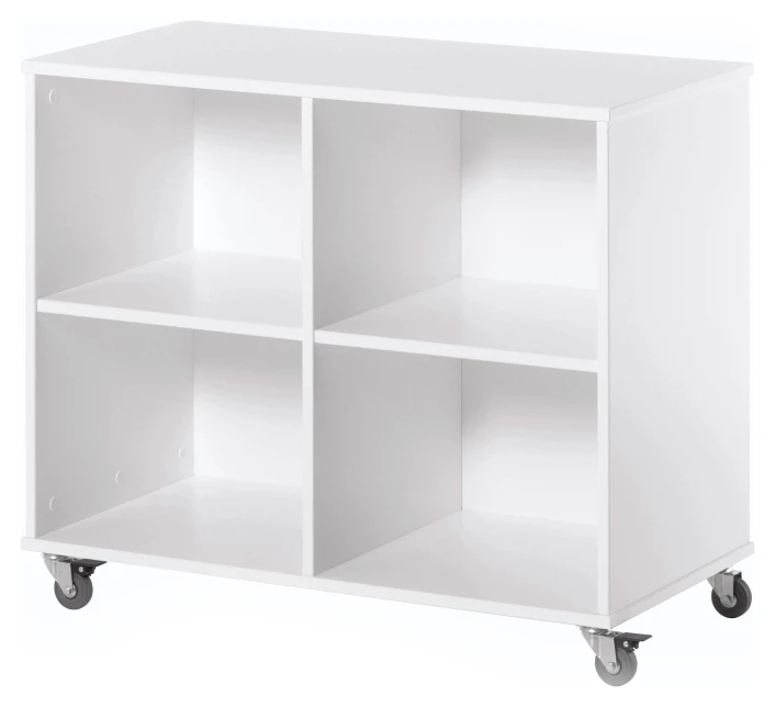 Fin 90′ reol fra HoppeKids i hvitt tre, med fire rom og hjul. Med denne stilrene reolen kan du en praktisk og fleksibel oppbevaringsløsning i barnehøyde. Reolen har en fin bakside og kan godt flyttes og plasseres som en romdeler. Har du en BASIC halvhøy seng fra HoppeKids kan reolen rulles under sengen, så plassen på barnerommet utnyttes optimalt.