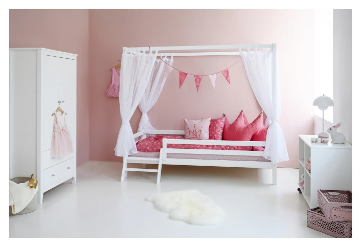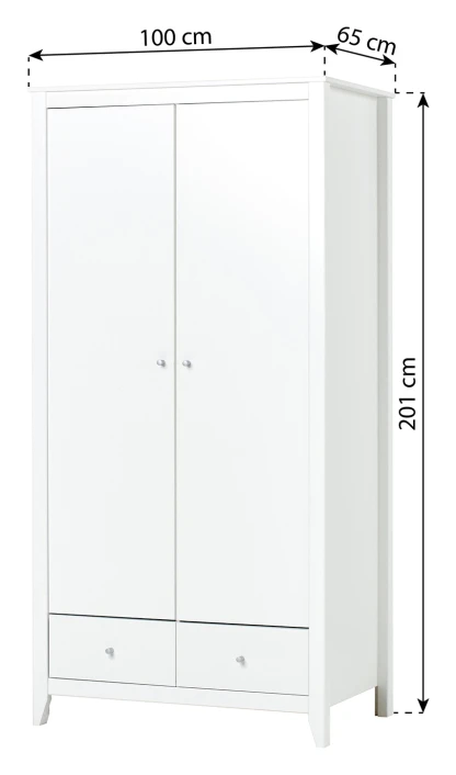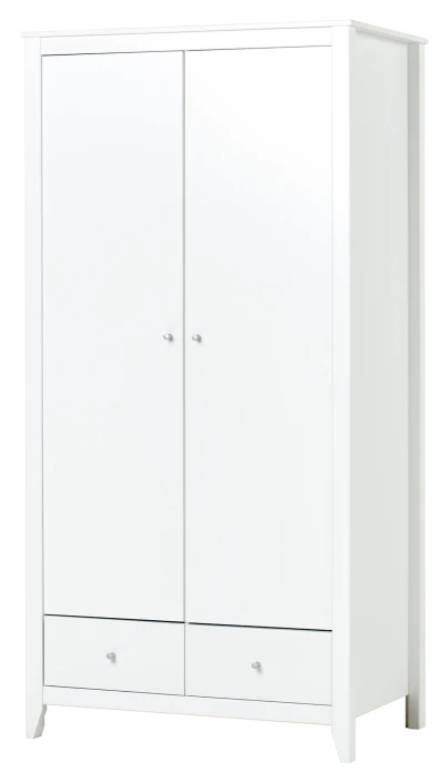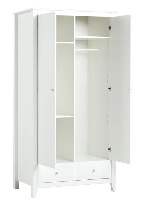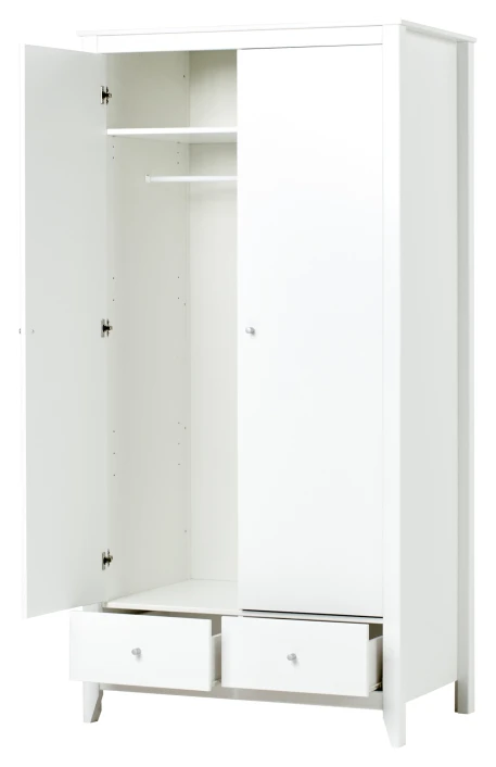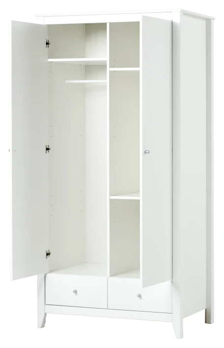 Fint garderobeskap fra Hoppekids med masse god oppbevaringsplass. Skapet har to skuffer og to skapdører. Bak frontene finner du på den ene siden to hyller og på den andre siden en hyller og en garderobestang. Et perfekt tøyskap til barn.