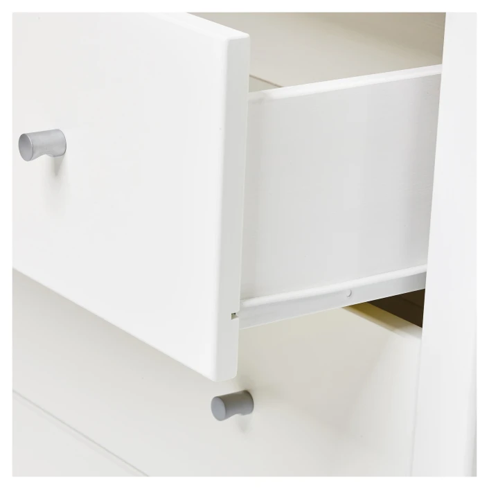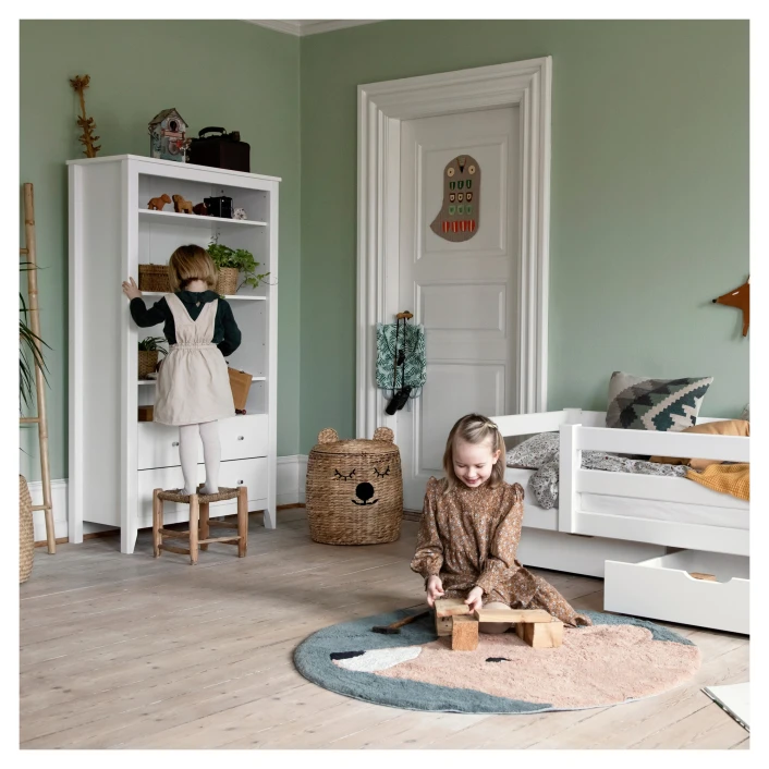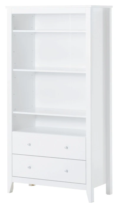 Hvitt skap fra HoppeKids med god oppbevaringsplass i to skuffer og tre hyller. Hans skapet kan brukes med alminnelige skapdører eller du kan kobinere skapet med et av de mange forskjellige, fine forhengene du finner i HoppeKids tekstilsortiment.