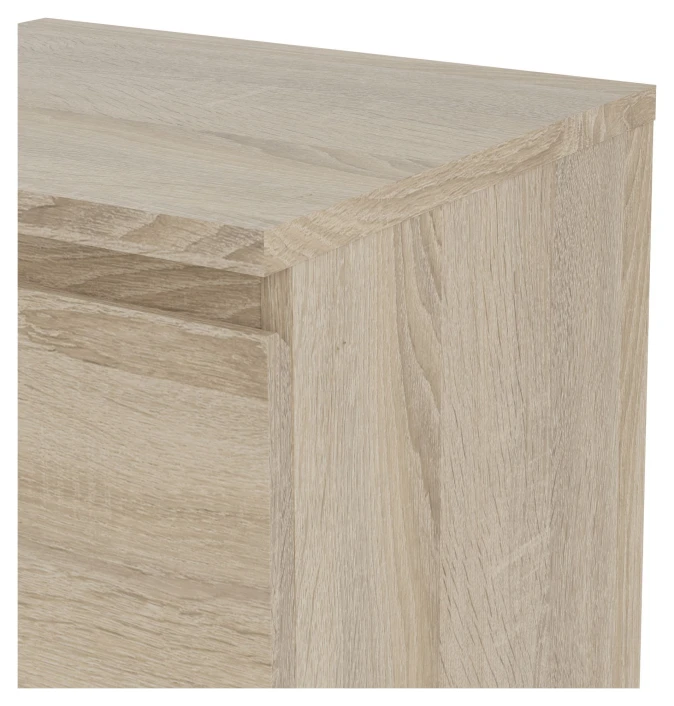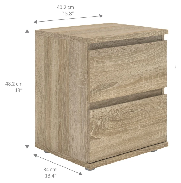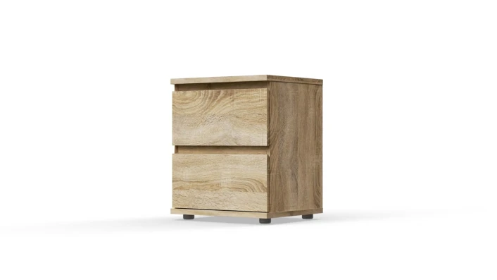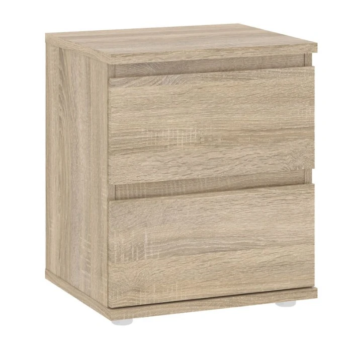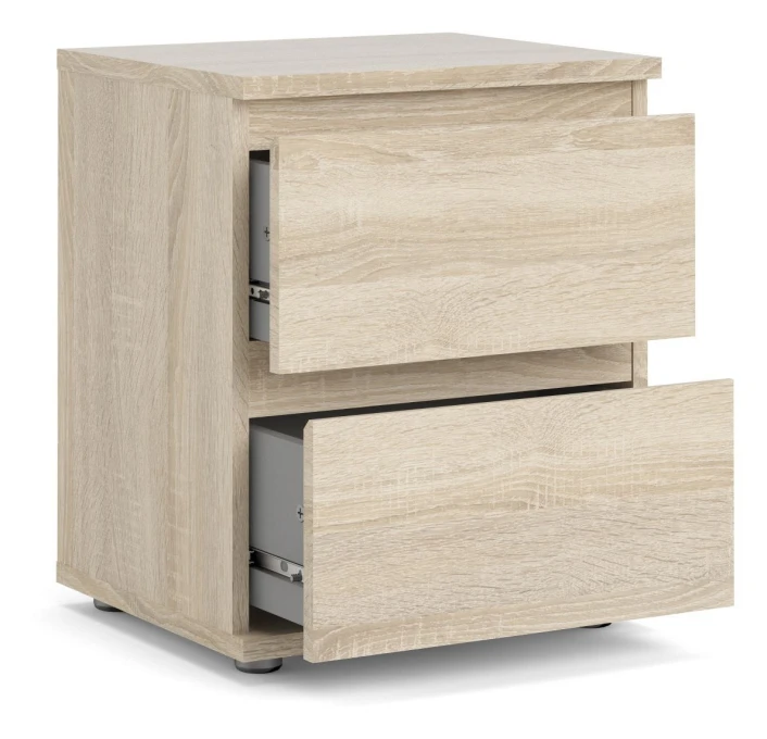 Smart lille sengebord i lyst tre. Sengebordet har to skuffer uten grep.
