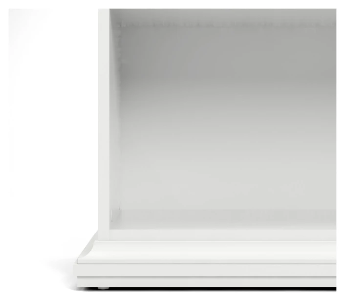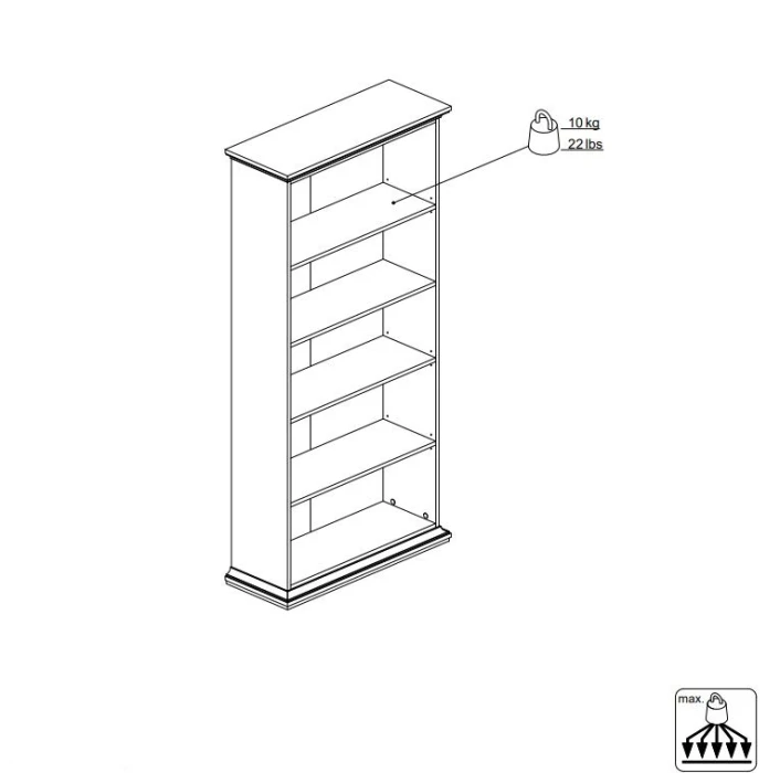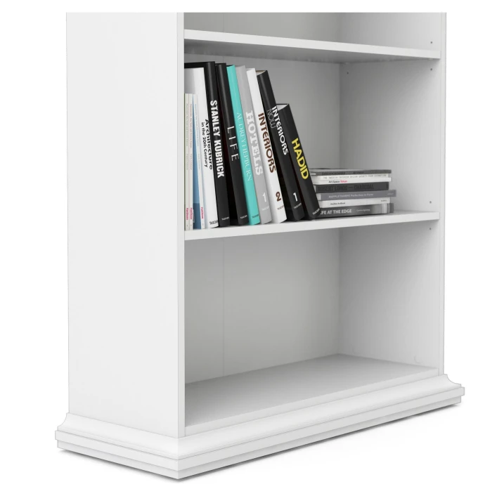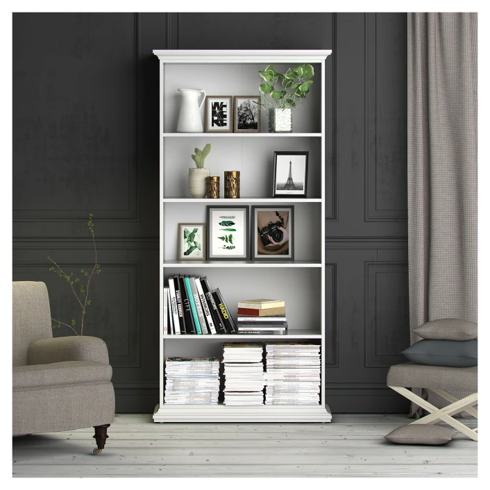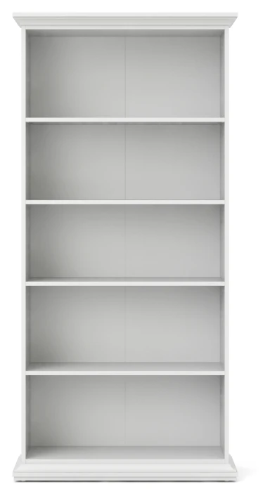 Bokreol i hvit med en fast hylle og tre hyller. Plasseringen på hyllene kan reguleres.