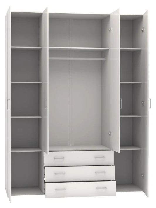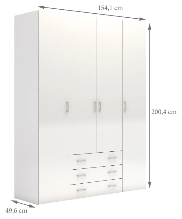Flot og simpelt garderobeskab i hvid. Skabet har tre brede skuffer og fire låger. I de to låger over skufferne er der en bøjlestang og en hylde. Bag lågerne i hver side er der fire hylder.