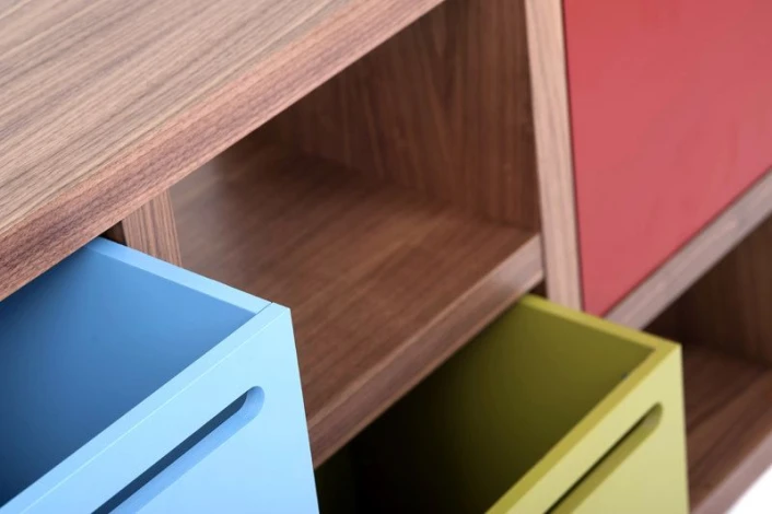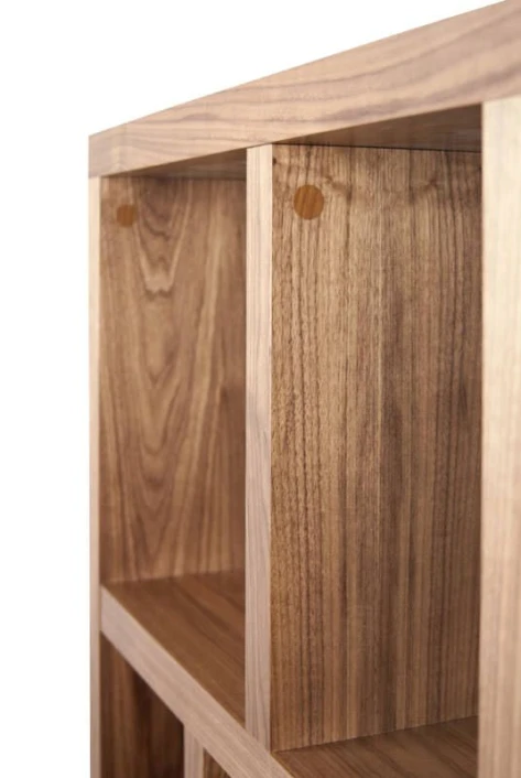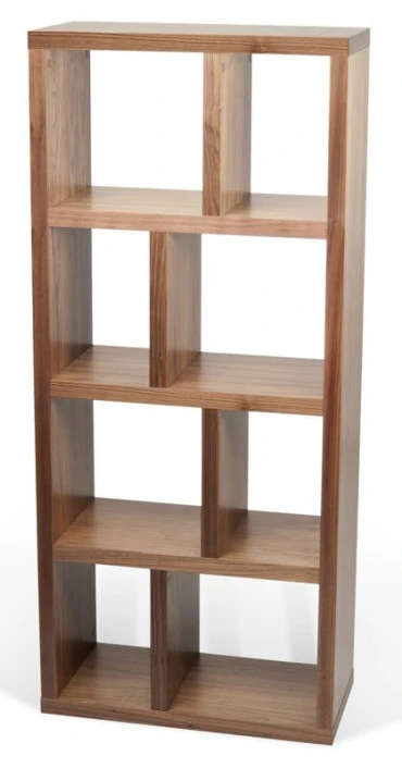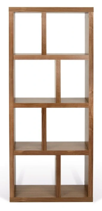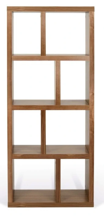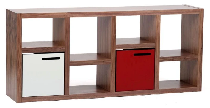 Flott og asymmetrisk reol i valnøtt-look med asymmetrisk romdeling i fire seksjoner. En raffinert finesse ved reolen er at den kan brukes begge veier. Dvs. at du kan veksle mellom en smal høy bokreol og en lav reol som f.eks. kan brukes som skjenk eller TV-bord. Reolen kan kombineres med bokser i flere ulike farger som passer i de kvadratiske rommene. Slik kan du tilpasse reolen til stilen og hjemmet ditt alt etter om den skal stå i stuen, på hjemmekontoret eller på barnerommet. Det perfekte møbel til alle rom!