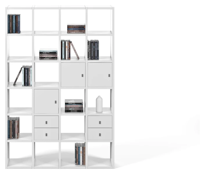 Stor hvit bokreol med 24 oppbevaringsrom. Med denne reolen er det enkelt ĂĄ fĂĄ plass til hele boksamlingen. Reolen kan ogsĂĄ brukes som en praktisk romdeler.